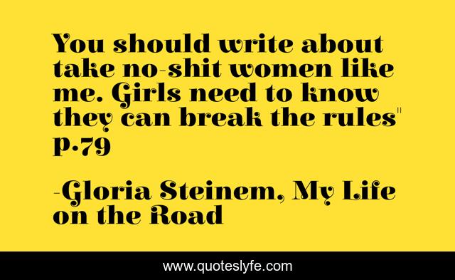This page presents the quote "You should write about take no-shit women like me. Girls need to know they can break the rules" p.79". Author of this quote is Gloria Steinem, My Life on the Road. .