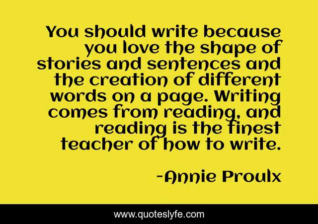 This page presents the quote "You should write because you love the shape of stories and sentences and the creation of different words on a page. Writing comes from reading, and reading is the finest teacher of how to write.". Author of this quote is Annie Proulx. This quote is about reading, words, writing,.