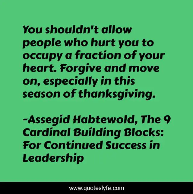 This page presents the quote "You shouldn't allow people who hurt you to occupy a fraction of your heart. Forgive and move on, especially in this season of thanksgiving.". Author of this quote is Assegid Habtewold, The 9 Cardinal Building Blocks: For Continued Success in Leadership. This quote is about hurt, move-on, thanksgiving, forgive,.