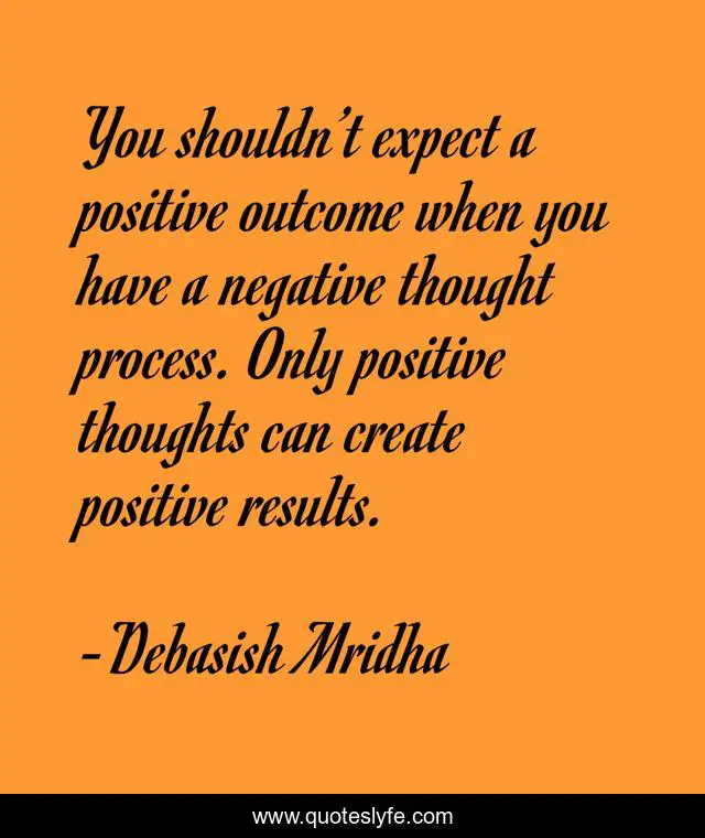 This page presents the quote "You shouldn’t expect a positive outcome when you have a negative thought process. Only positive thoughts can create positive results.". Author of this quote is Debasish Mridha. This quote is about philosophy, debasish-mridha, create-positive-results, quotes, negative-thoughts, inspirational, positive-thoughts, enthusiasm, debasish-mridha-m-d,.