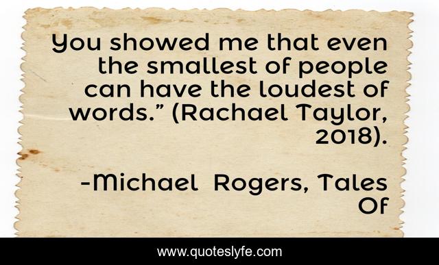 This page presents the quote "You showed me that even the smallest of people can have the loudest of words.” (Rachael Taylor, 2018).". Author of this quote is Michael Rogers, Tales Of. This quote is about rostical, inspirational, inspirational-life, enthusiasm, kindness, friendship,.