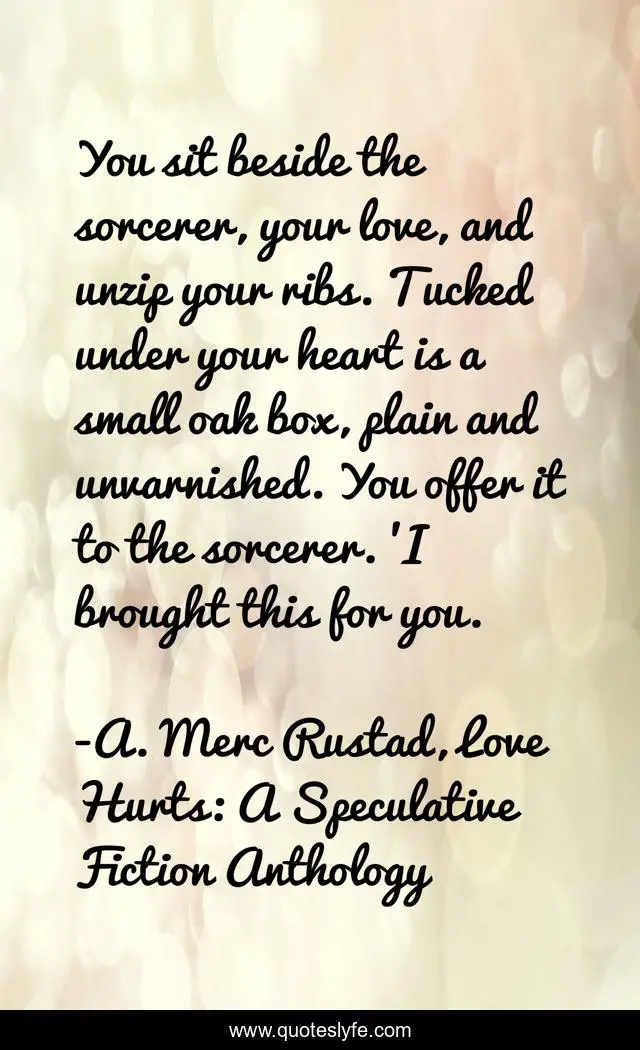 This page presents the quote "You sit beside the sorcerer, your love, and unzip your ribs. Tucked under your heart is a small oak box, plain and unvarnished. You offer it to the sorcerer. 'I brought this for you.". Author of this quote is A. Merc Rustad, Love Hurts: A Speculative Fiction Anthology. This quote is about fantasy, short-story, love-hurts, speculative-fiction, shadow, short-story-collection, sorcerer,.