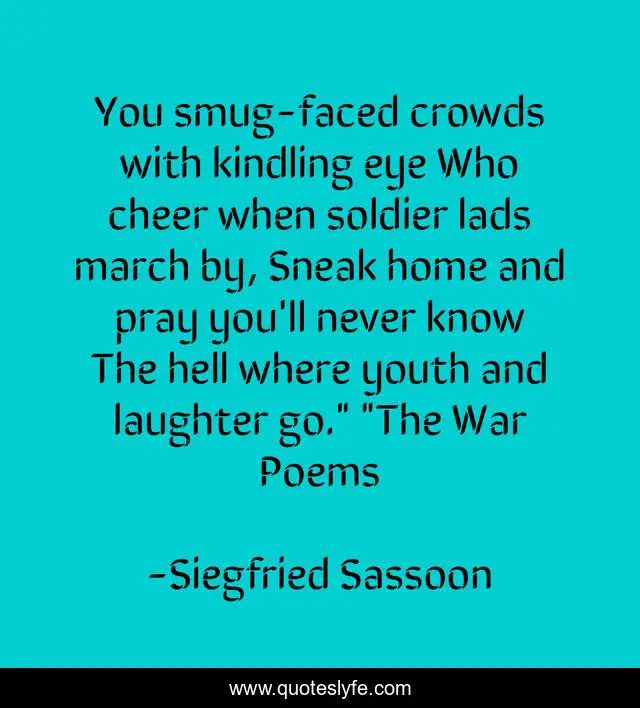 This page presents the quote "You smug-faced crowds with kindling eye Who cheer when soldier lads march by, Sneak home and pray you'll never know The hell where youth and laughter go." "The War Poems". Author of this quote is Siegfried Sassoon. .