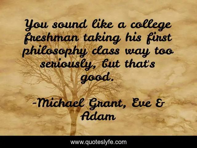 This page presents the quote "You sound like a college freshman taking his first philosophy class way too seriously, but that's good.". Author of this quote is Michael Grant, Eve & Adam. This quote is about freshman, philosophy, college,.