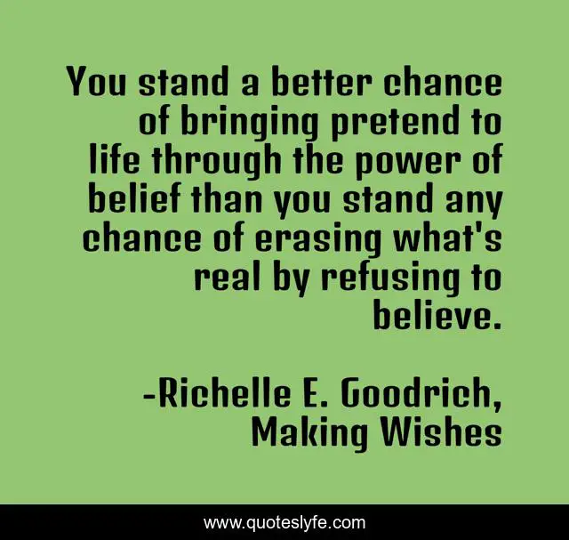 This page presents the quote "You stand a better chance of bringing pretend to life through the power of belief than you stand any chance of erasing what's real by refusing to believe.". Author of this quote is Richelle E. Goodrich, Making Wishes. This quote is about real, belief, richelle-e-goodrich, pretend, unreal, richelle, truth, richelle-goodrich, believe,.