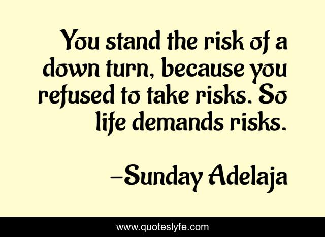 This page presents the quote "You stand the risk of a down turn, because you refused to take risks. So life demands risks.". Author of this quote is Sunday Adelaja. This quote is about life, risk, demand,.