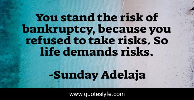 This page presents the quote "You stand the risk of bankruptcy, because you refused to take risks. So life demands risks.". Author of this quote is Sunday Adelaja. This quote is about life, bankruptcy, risk, demands,.