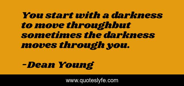 This page presents the quote "You start with a darkness to move throughbut sometimes the darkness moves through you.". Author of this quote is Dean Young. This quote is about hard-times, darkness,.