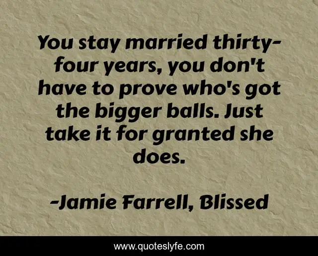 This page presents the quote "You stay married thirty-four years, you don't have to prove who's got the bigger balls. Just take it for granted she does.". Author of this quote is Jamie Farrell, Blissed. This quote is about small-town-romance, contemporary-romance,.