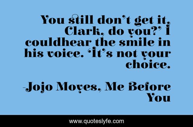 This page presents the quote "You still don’t get it, Clark, do you?’ I couldhear the smile in his voice. ‘It’s not your choice.". Author of this quote is Jojo Moyes, Me Before You. .