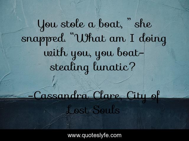 This page presents the quote "You stole a boat, ” she snapped. “What am I doing with you, you boat-stealing lunatic?". Author of this quote is Cassandra Clare, City of Lost Souls. This quote is about boat-stealing-lunatic, humour,.