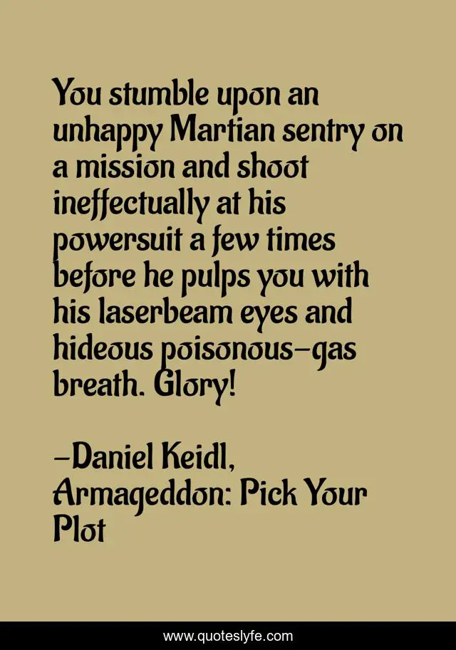 "Daniel Keidl, Armageddon: Pick Your Plot Quotes." Quoteslyfe.com, 2025. Sat. 06 Dec. 2025. <https://www.quoteslyfe.com/quote/You-stumble-upon-an-unhappy-Martian-sentry-157536>.