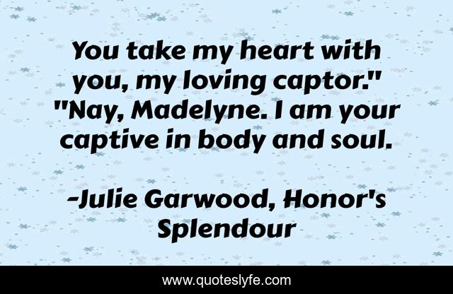 This page presents the quote "You take my heart with you, my loving captor." "Nay, Madelyne. I am your captive in body and soul.". Author of this quote is Julie Garwood, Honor's Splendour. This quote is about honors-splendour, romance, julie-garwood,.