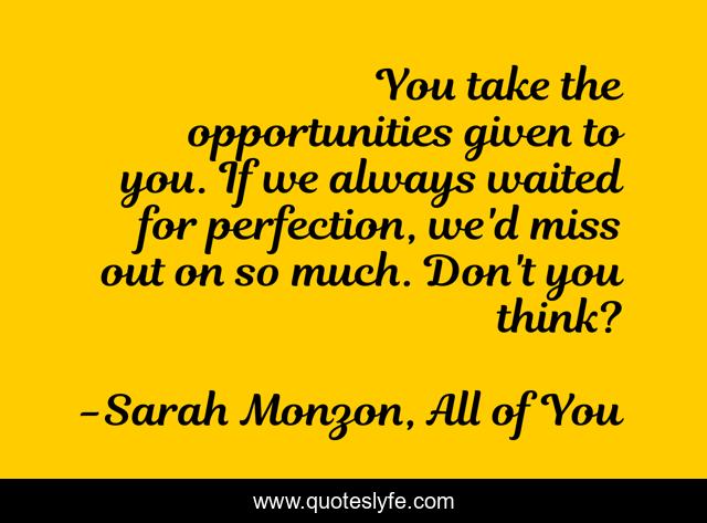 This page presents the quote "You take the opportunities given to you. If we always waited for perfection, we'd miss out on so much. Don't you think?". Author of this quote is Sarah Monzon, All of You. This quote is about romance, enthusiasm, christian, inspirational,.