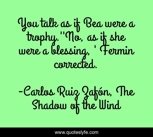 This page presents the quote "You talk as if Bea were a trophy.''No, as if she were a blessing, ' Fermin corrected.". Author of this quote is Carlos Ruiz Zafón, The Shadow of the Wind. This quote is about trophy, cute, love, blessing, affection, women,.