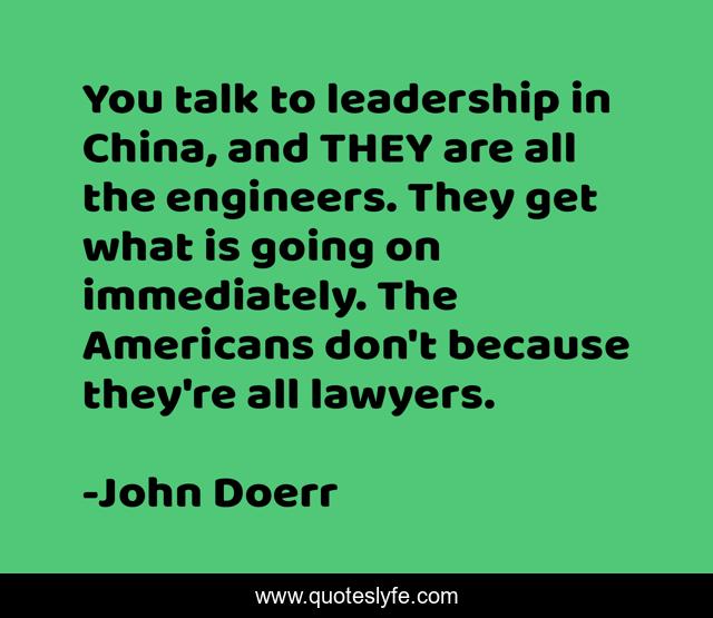 This page presents the quote "You talk to leadership in China, and THEY are all the engineers. They get what is going on immediately. The Americans don't because they're all lawyers.". Author of this quote is John Doerr. This quote is about job, leadership, expertise, location, calling,.