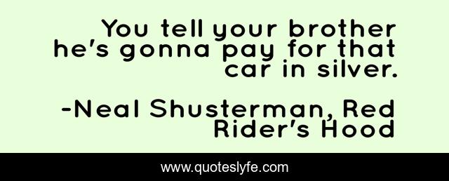 This page presents the quote "You tell your brother he's gonna pay for that car in silver.". Author of this quote is Neal Shusterman, Red Rider's Hood. This quote is about funny, revenge, comedy, cheesy, werewolf,.