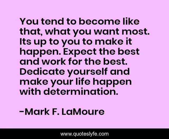 This page presents the quote "You tend to become like that, what you want most. Its up to you to make it happen. Expect the best and work for the best. Dedicate yourself and make your life happen with determination.". Author of this quote is Mark F. LaMoure. This quote is about exceptional-people, high-caliber, high-quality, success, positive, excellent-people, excellent, confidence, excellence,.