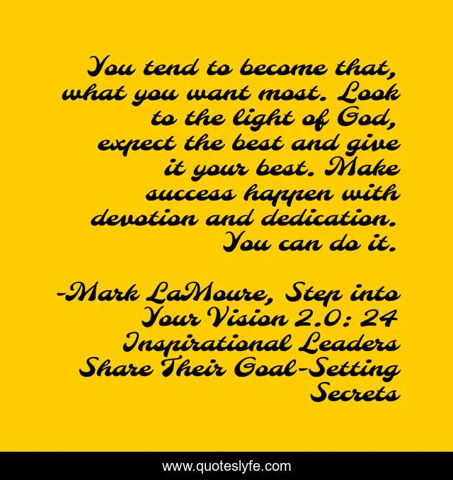This page presents the quote "You tend to become that, what you want most. Look to the light of God, expect the best and give it your best. Make success happen with devotion and dedication. You can do it.". Author of this quote is Mark LaMoure, Step into Your Vision 2.0: 24 Inspirational Leaders Share Their Goal-Setting Secrets. This quote is about exceptional-people, high-caliber, success, positive, excellent-people, excellent, confidence, excellence, self-improvement,.