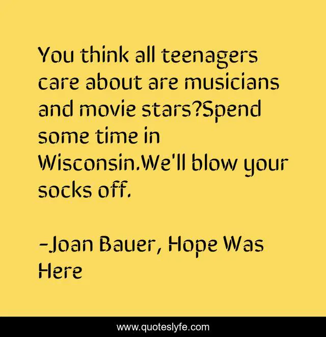 This page presents the quote "You think all teenagers care about are musicians and movie stars?Spend some time in Wisconsin.We'll blow your socks off.". Author of this quote is Joan Bauer, Hope Was Here. This quote is about youth, wisconsin, issues,.