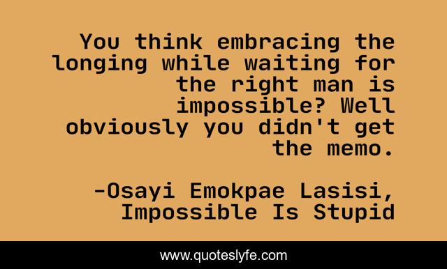 This page presents the quote "You think embracing the longing while waiting for the right man is impossible? Well obviously you didn't get the memo.". Author of this quote is Osayi Emokpae Lasisi, Impossible Is Stupid. This quote is about impossible, love, relationship, affection, longing,.