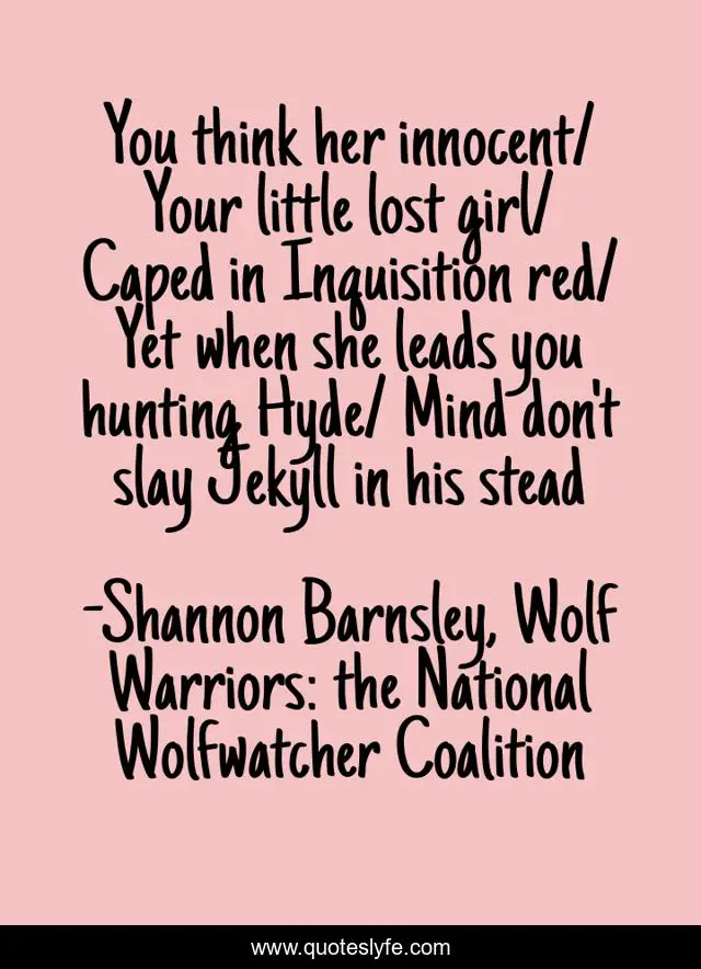"Shannon Barnsley, Wolf Warriors: the National Wolfwatcher Coalition Quotes." Quoteslyfe.com, 2025. Sat. 06 Dec. 2025. <https://www.quoteslyfe.com/quote/You-think-her-innocent-Your-little-lost-182278>.