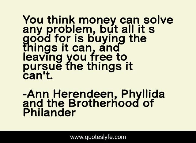 This page presents the quote "You think money can solve any problem, but all it s good for is buying the things it can, and leaving you free to pursue the things it can't.". Author of this quote is Ann Herendeen, Phyllida and the Brotherhood of Philander. This quote is about money, wisdom,.