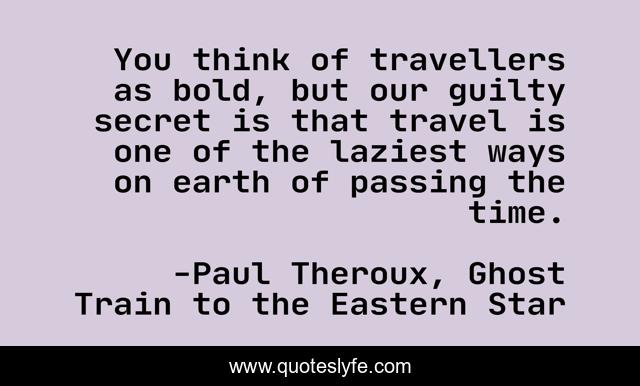 This page presents the quote "You think of travellers as bold, but our guilty secret is that travel is one of the laziest ways on earth of passing the time.". Author of this quote is Paul Theroux, Ghost Train to the Eastern Star. This quote is about travel, lazyness, traveller,.