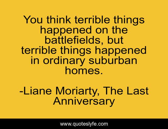 This page presents the quote "You think terrible things happened on the battlefields, but terrible things happened in ordinary suburban homes.". Author of this quote is Liane Moriarty, The Last Anniversary. This quote is about mystery, island, life, secret, family,.