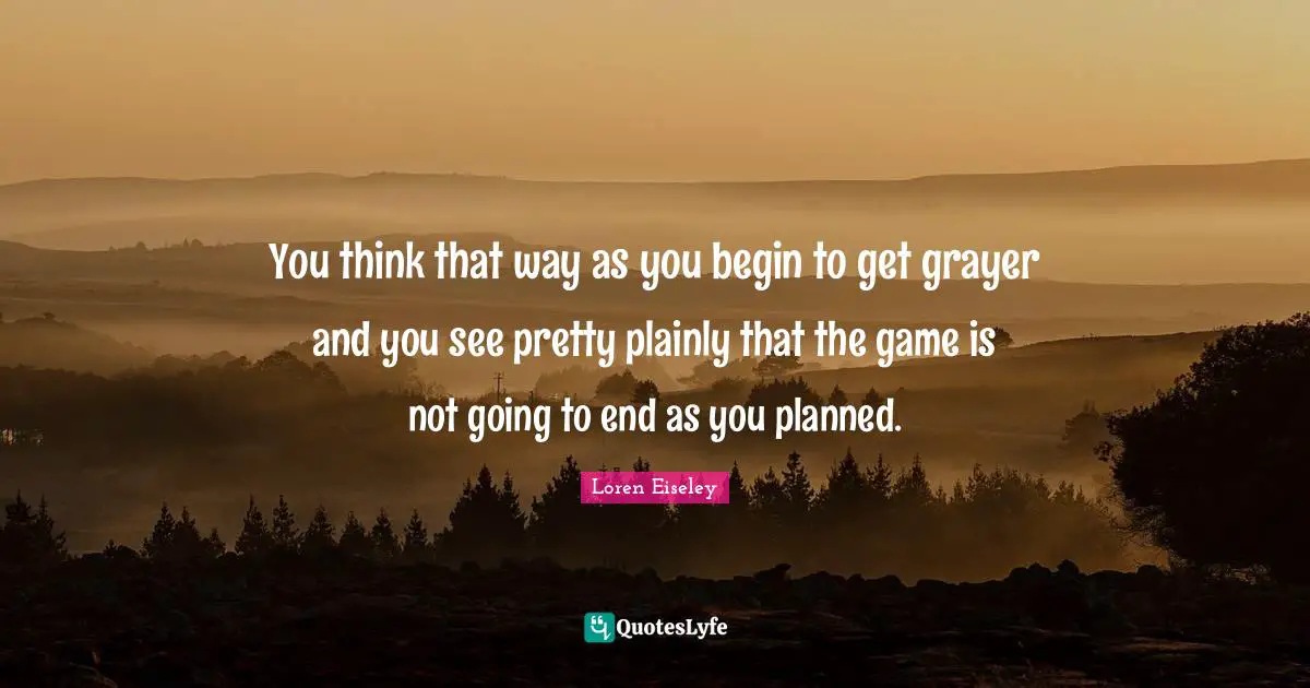 This page presents the quote "You think that way as you begin to get grayer and you see pretty plainly that the game is not going to end as you planned.". Author of this quote is Loren Eiseley. This quote is about way, philosophy, games, thinking,.