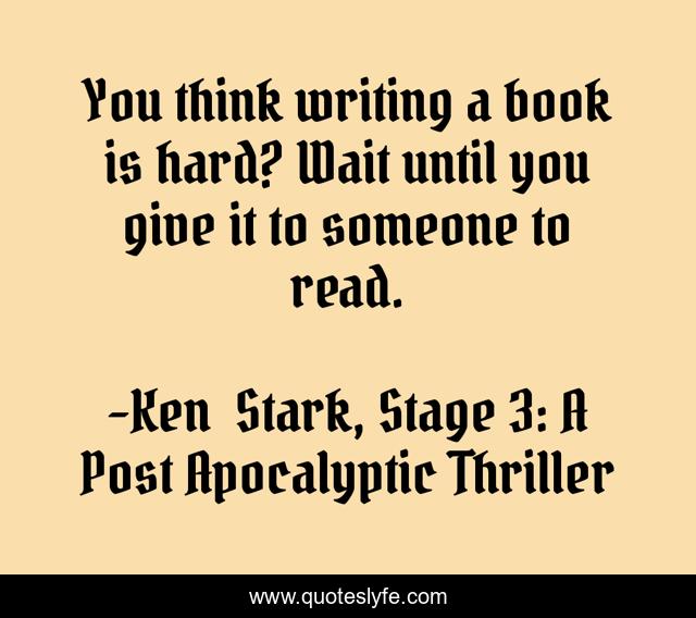 This page presents the quote "You think writing a book is hard? Wait until you give it to someone to read.". Author of this quote is Ken Stark, Stage 3: A Post Apocalyptic Thriller. This quote is about writing, book, books, humour-author, inspirational, enthusiasm,.