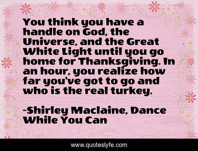 This page presents the quote "You think you have a handle on God, the Universe, and the Great White Light until you go home for Thanksgiving. In an hour, you realize how far you've got to go and who is the real turkey.". Author of this quote is Shirley Maclaine, Dance While You Can. This quote is about humorous, dysfunctional-families, family-dinners,.