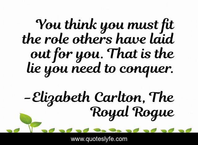 This page presents the quote "You think you must fit the role others have laid out for you. That is the lie you need to conquer.". Author of this quote is Elizabeth Carlton, The Royal Rogue. This quote is about lie, life, persona, role, identity,.
