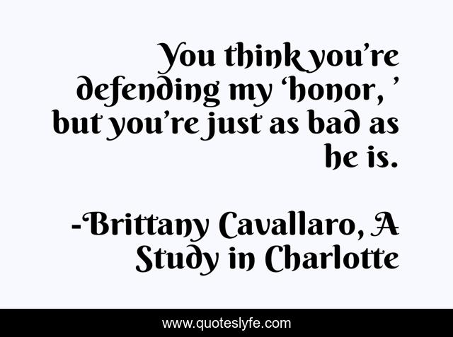 This page presents the quote "You think you’re defending my ‘honor, ’ but you’re just as bad as he is.". Author of this quote is Brittany Cavallaro, A Study in Charlotte. This quote is about honor, feminist,.