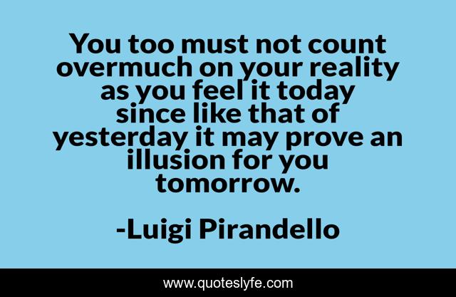 This page presents the quote "You too must not count overmuch on your reality as you feel it today since like that of yesterday it may prove an illusion for you tomorrow.". Author of this quote is Luigi Pirandello. .