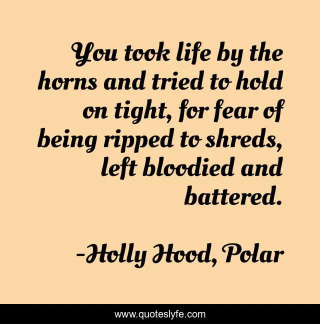 This page presents the quote "You took life by the horns and tried to hold on tight, for fear of being ripped to shreds, left bloodied and battered.". Author of this quote is Holly Hood, Polar. This quote is about life, inspiration, reality,.