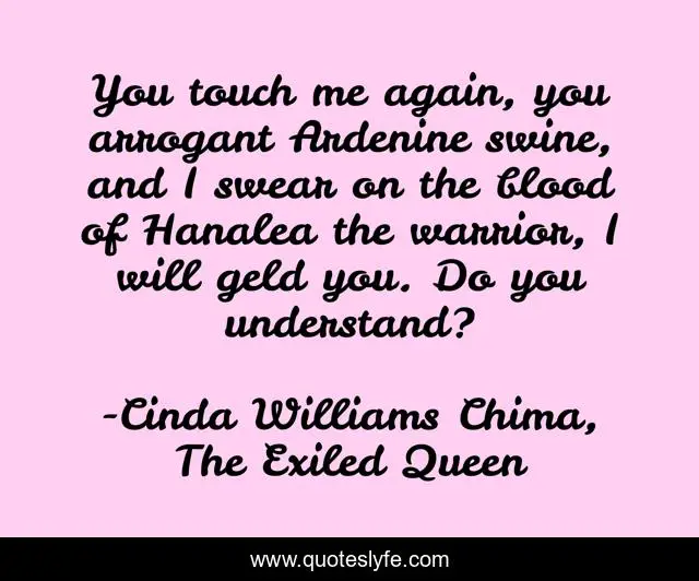 This page presents the quote "You touch me again, you arrogant Ardenine swine, and I swear on the blood of Hanalea the warrior, I will geld you. Do you understand?". Author of this quote is Cinda Williams Chima, The Exiled Queen. This quote is about raisa, strength, bravery,.