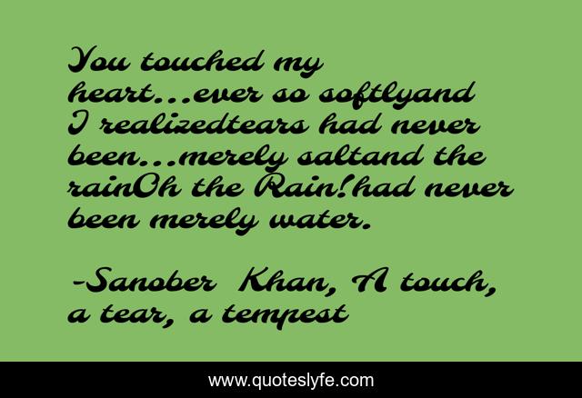 This page presents the quote "You touched my heart...ever so softlyand I realizedtears had never been...merely saltand the rainOh the Rain!had never been merely water.". Author of this quote is Sanober Khan, A touch, a tear, a tempest. This quote is about poets, love, indian-authors, poetry, verses, tears, metaphors, affection,.