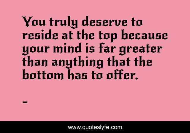 This page presents the quote "You truly deserve to reside at the top because your mind is far greater than anything that the bottom has to offer.". Author of this quote is . This quote is about the-top, the-bottom, you-deserve-to-be-at-the-top, edmond-mbiaka, the-ootom-is-not-a-place-for-you, your-mind, you-belong-at-the-top,.