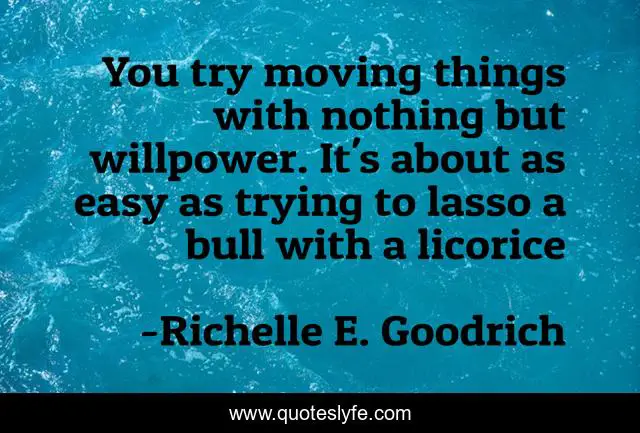 This page presents the quote "You try moving things with nothing but willpower. It's about as easy as trying to lasso a bull with a licorice". Author of this quote is Richelle E. Goodrich. This quote is about phantom-s-veil, gwen, moving, willpower, richelle, richelle-goodrich,.