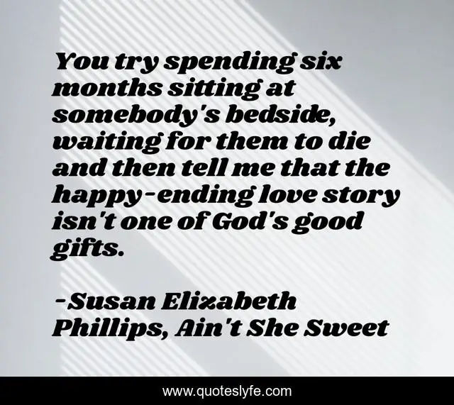 This page presents the quote "You try spending six months sitting at somebody's bedside, waiting for them to die and then tell me that the happy-ending love story isn't one of God's good gifts.". Author of this quote is Susan Elizabeth Phillips, Ain't She Sweet. This quote is about gifts, death, love, romance, novel, love-story, affection, romance-novel,.