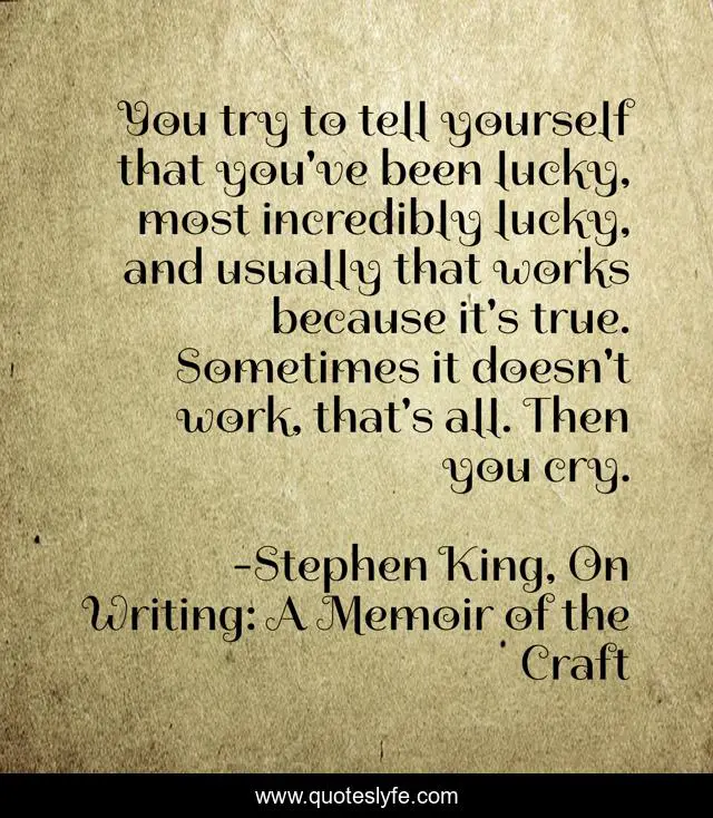 This page presents the quote "You try to tell yourself that you've been lucky, most incredibly lucky, and usually that works because it's true. Sometimes it doesn't work, that's all. Then you cry.". Author of this quote is Stephen King, On Writing: A Memoir of the Craft. .