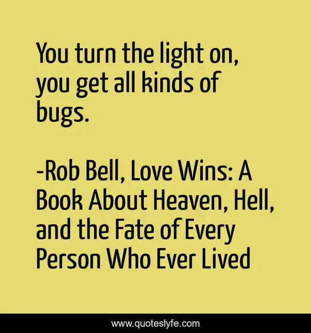 This page presents the quote "You turn the light on, you get all kinds of bugs.". Author of this quote is Rob Bell, Love Wins: A Book About Heaven, Hell, and the Fate of Every Person Who Ever Lived. This quote is about hell, heaven, spirtuality, religion,.