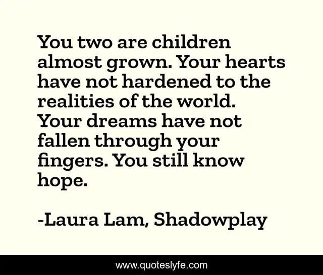 This page presents the quote "You two are children almost grown. Your hearts have not hardened to the realities of the world. Your dreams have not fallen through your fingers. You still know hope.". Author of this quote is Laura Lam, Shadowplay. This quote is about young-adults, dreams, adults, hope, children,.