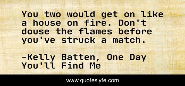 This page presents the quote "You two would get on like a house on fire. Don't douse the flames before you've struck a match.". Author of this quote is Kelly Batten, One Day You'll Find Me. This quote is about house-on-fire, friends, flames,.