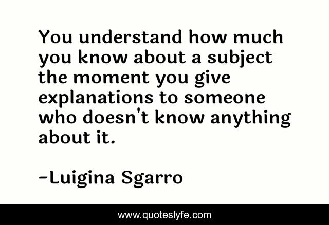This page presents the quote "You understand how much you know about a subject the moment you give explanations to someone who doesn't know anything about it.". Author of this quote is Luigina Sgarro. This quote is about competence, learning,.