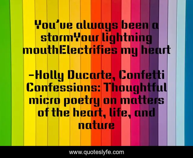 "Holly Ducarte, Confetti Confessions: Thoughtful micro poetry on matters of the heart, life, and nature Quotes." Quoteslyfe.com, 2025. Sat. 06 Dec. 2025. <https://www.quoteslyfe.com/quote/You-ve-always-been-a-stormYour-lightning-89990>.