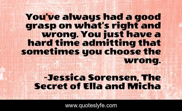 This page presents the quote "You've always had a good grasp on what's right and wrong. You just have a hard time admitting that sometimes you choose the wrong.". Author of this quote is Jessica Sorensen, The Secret of Ella and Micha. .