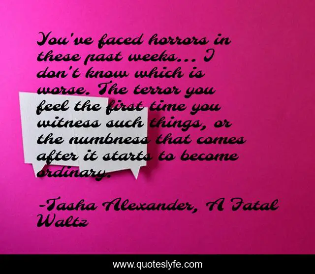This page presents the quote "You've faced horrors in these past weeks... I don't know which is worse. The terror you feel the first time you witness such things, or the numbness that comes after it starts to become ordinary.". Author of this quote is Tasha Alexander, A Fatal Waltz. This quote is about terror, horror, tragedy, experience, numbness,.