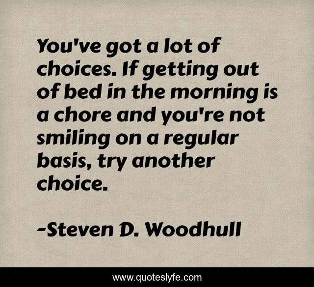 This page presents the quote "You've got a lot of choices. If getting out of bed in the morning is a chore and you're not smiling on a regular basis, try another choice.". Author of this quote is Steven D. Woodhull. This quote is about smile, wise-words, happiness,.